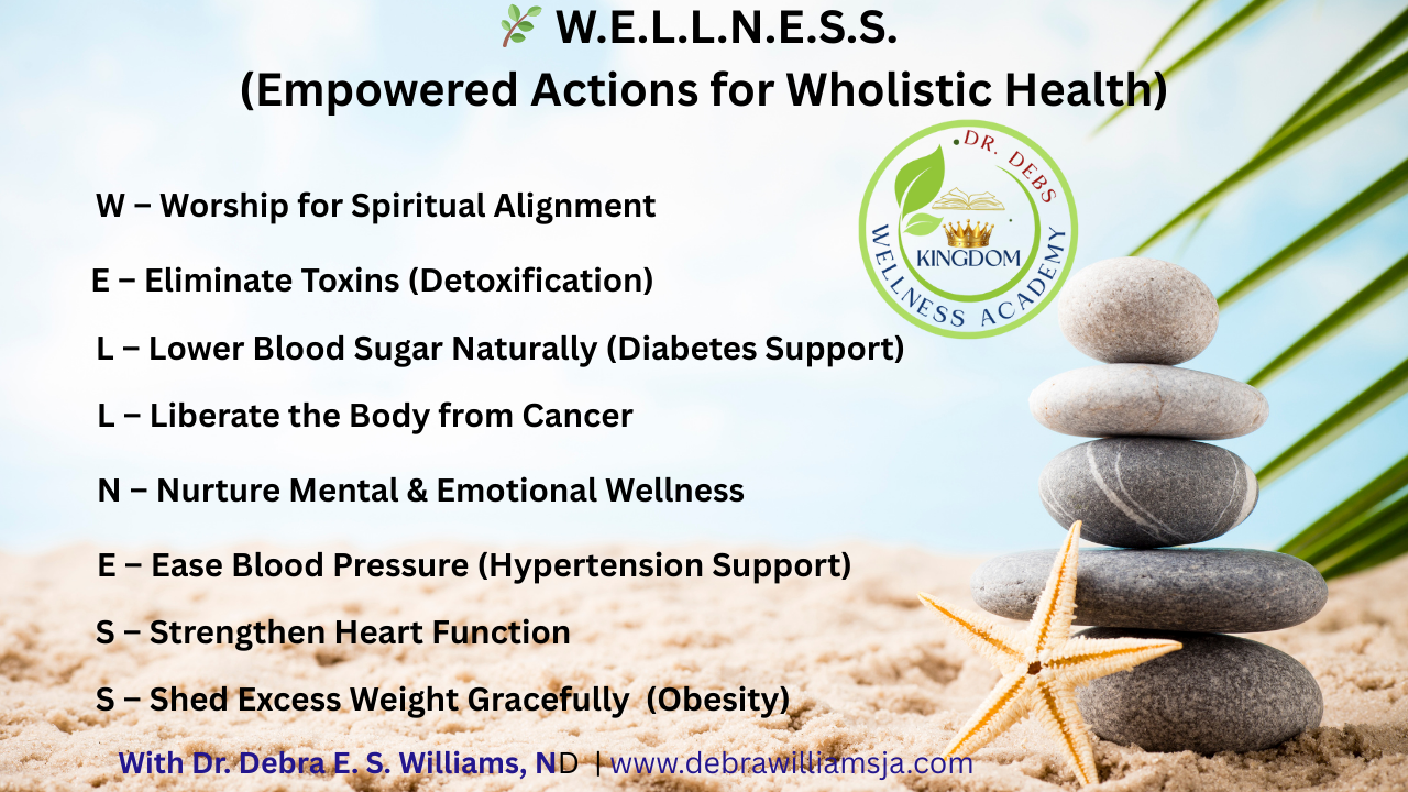 The Dr. Debs Kingdom WELLNESS Academy stands as a beacon in the realm of health and wellness. More than a course, it is a lifelong fellowship and masterclass rooted in unshakable biblical truth and cutting-edge natural health science. You will be equipped with practical, Christ-centered tools not just to manage symptoms, but to prevent disease, reverse chronic conditions, and fortify your body temple for a life of purpose. Through our 8 Pillars of Empowered Health, the comprehensive W.E.L.L.N.E.S.S. framework guides you step-by-step, transforming worship, nutrition, detoxification, emotional resilience, and movement into pillars of your daily optimum health journey. You are not just learning principles—you are mastering a new way of living, designed to glorify our Heavenly Father in every choice, every habit, and every healed testimony.